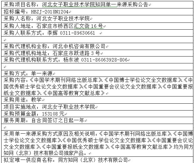 河北女子職業(yè)技術(shù)學(xué)院知網(wǎng)單一來源采購(gòu)公告