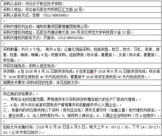 項目名稱:河北女子職業技術學院公寓化用品及校服采購