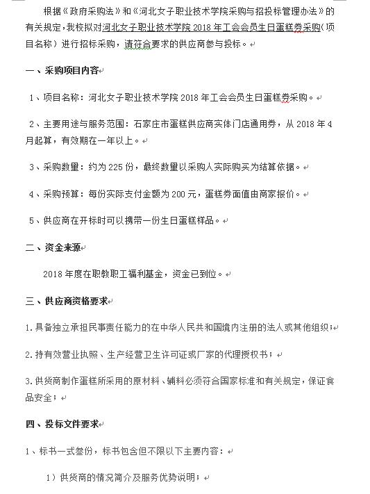 河北女子職業技術學院 2018年工會會員蛋糕券采購招標公告