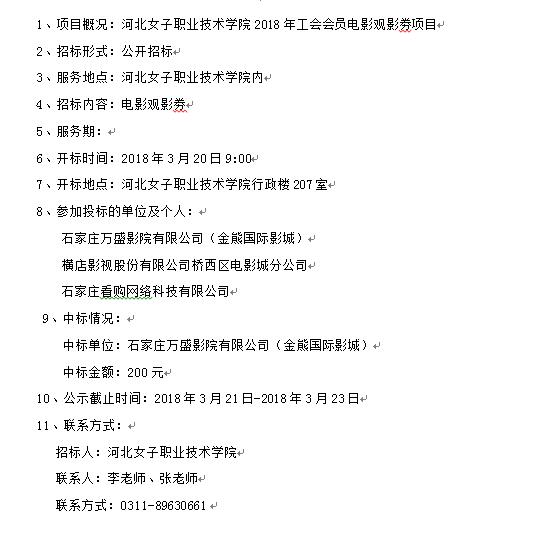河北女子職業(yè)技術(shù)學(xué)院2018年工會會員電影觀影劵項(xiàng)目 中標(biāo)公告