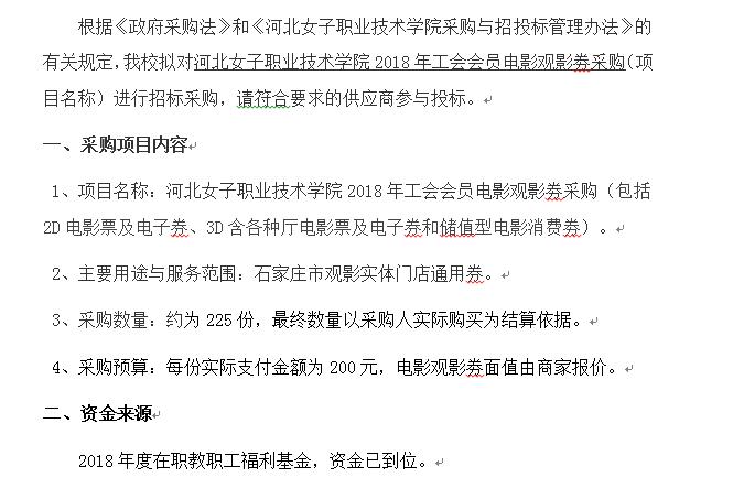 河北女子職業技術學院 2018年工會會員電影觀影劵采購招標公告