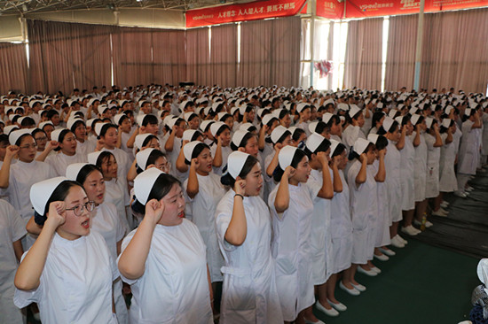 護士節活動在大合唱《和你一樣》中拉開了帷幕;梁冰峰老師首先致辭,寄語同學們要堅定理想信念,在刻苦學習專業知識之余,也要積極參與學生工作活動,提高自身綜合能力;在專業技能展示環節,優秀實習生代表向大家展示了心肺復蘇操作,整齊嚴謹的動作迎來了陣陣喝彩;護理專業同學自編自演的小品《雅安地震中最美麗的身影》,展現了同學們對護理崗位的憧憬和向往;在十九大精神指引下,同學們還特別編排了舞蹈《芳華》,身著綠軍裝的同學們展現了對革命先烈的無限懷念和敬意;護士節最神圣的時刻是授帽環節:馬曉卿等四位教師為同學授帽,全體同學高舉右手、慷慨誓詞,向“提燈女神”南丁格爾致以莊嚴而神圣的敬意。
