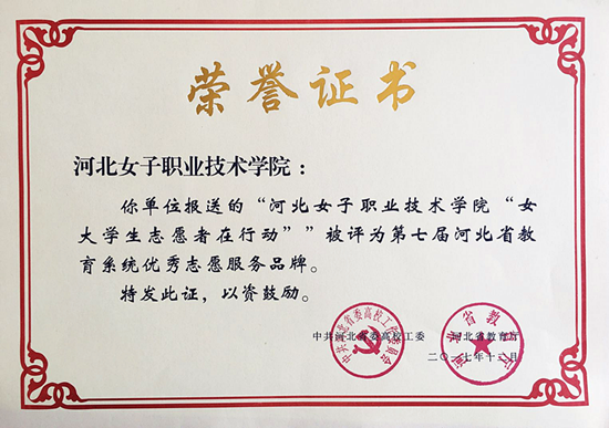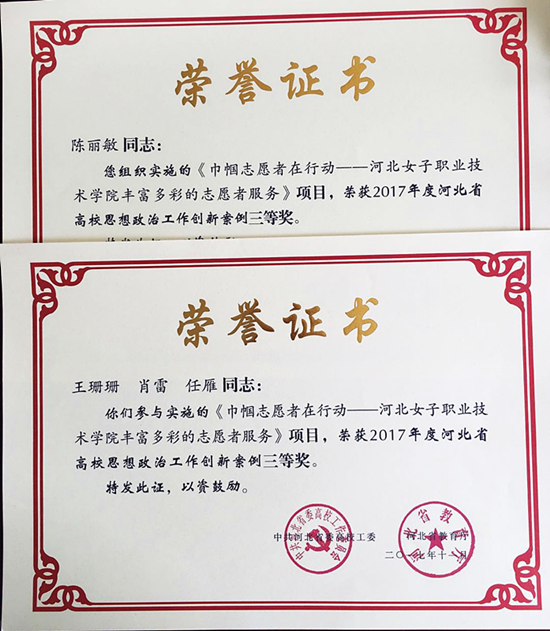 為引導我院廣大青年學生積極參與志愿服務,推動青年志愿者事業深入發展,構建具有巾幗特色、滿足城鄉社區群眾和家庭需求的巾幗志愿服務體系,學院團委、各系團總支組織開展了以學院專業特色為引領,以服務廣大家庭生活需求和精神文化需求為出發點的豐富多樣的志愿服務活動,得到了社會各界廣泛好評。“河北女子職業技術學院——女大學生志愿者在行動”被評為第七屆河北省教育系統優秀志愿服務品牌;陳麗敏、肖雷、任雁、王珊珊老師報送的《河北女子職業技術學院豐富多彩的志愿者服務》項目,榮獲2017年度河北省高校思想政治工作創新案例三等獎。