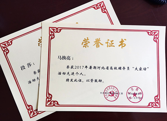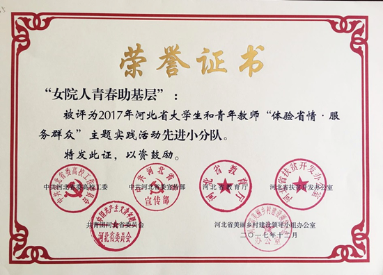 為進一步培育和弘揚社會主義核心價值觀,增強大學生的社會責任感,積極引導廣大師生投身社會實踐,我院團委組織開展了豐富多彩的暑期社會實踐活動,促進廣大青年師生在社會實踐活動中“進社會、知省情、受教育、長才干、做貢獻”,為推進河北“綠色崛起、科學發展”積極貢獻女院人的智慧和力量。活動得到了河北省教育廳、河北省委宣傳部、河北省高校工作委員會、河北省扶貧開發辦公室以及團省委的高度評價。我院“女院人青春助基層”實踐隊伍被評為2017年河北省大學生和青年教師“體驗省情.服務群眾”主題實踐活動先進小分隊;李根、張伯瑜老師被評為優秀指導教師;學前教育系馬臻、護理系吉嬌嬌兩名同學被評為優秀實踐隊員。(信息來源:學生處)