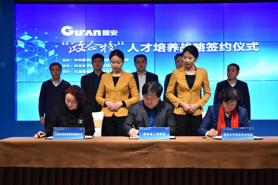 為服務京津冀協同發展戰略,充分發揮地方政府、高校與企業三方資源優勢,滿足固安經濟社會發展對現代服務業人才的需求,2018年2月2日下午,固安縣委縣政府、三浦威特園區建設發展有限公司、河北女子職業技術學院“政企校”人才培養戰略簽約儀式在固安規劃館舉行。固安縣縣長王海代表固安縣委縣政府致辭;學院院長蓋春瑞介紹了學院辦學情況和合作項目實施計劃;學院黨委書記竇新順發表了講話。