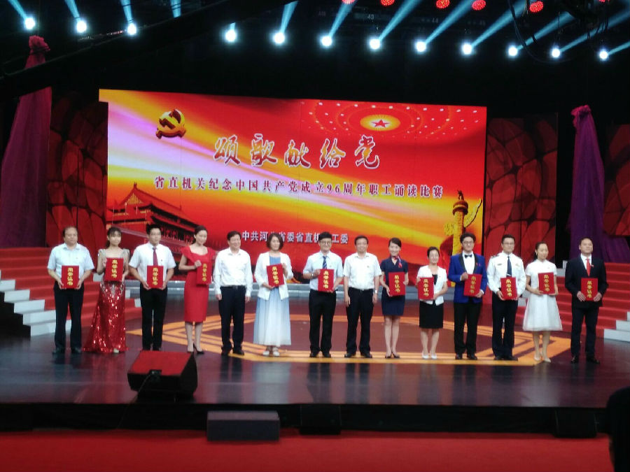 自今年5月省直工委開展此項活動以來,學院黨委高度重視,以支部為單位組織開展學院職工誦讀比賽,并推選出兩名表現優異的教師參加省直工委復賽。我院教師不辭辛苦,帶領學生加班加點排練,對作品不斷提升,精益求精,最終從98個單位的108件作品中脫穎而出,成功入圍決賽。30日下午的決賽中,學院師生團結一心,飽含深情地誦讀了歌頌黨和祖國母親的作品--《我愛我的南方和北方》,贏得了現場觀眾的熱烈掌聲,最終榮獲二等獎的優異成績。