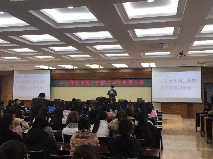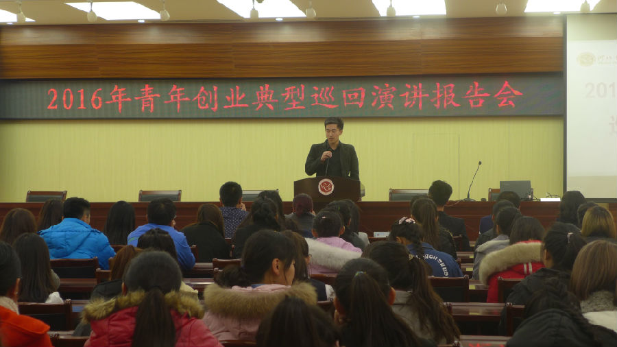 11月11日,由河北省人力資源和社會保障廳、共青團河北省委聯合主辦的“河北省2016青年創業典型演講報告會”在我院新思維交流中心舉行。省人力資源和社會保障廳石蕃同志帶領包括我院2014屆畢業生李文峰在內的7名青年創業成功典型代表到我院做事跡報告。學院副院長徐愛新、創新創業學院常務副院長孫彩虹和全院200余名師生一起聆聽了報告。