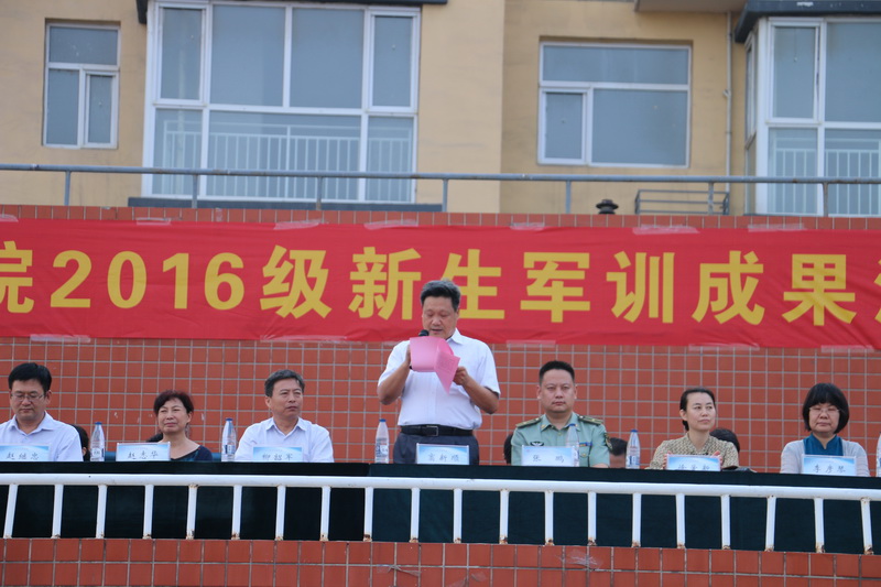 9月14日下午,我院在運動場隆重舉行了2016級新生軍訓匯報表演暨總結表彰大會。黨委書記竇新順、石家莊機械化步兵學院院務部勤務保障營教導員張鵬、黨委副書記柳韶軍、副院長徐愛新、紀委書記趙志華、副院長李彥琴及有關部門負責人出席了大會;大會由副院長徐愛新主持。