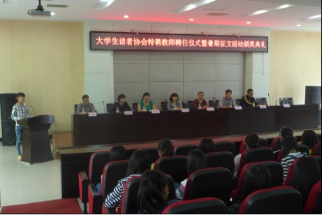 為了加強讀者協(xié)會與各系的交流與聯(lián)系,提高讀者協(xié)會理事會成員的能力與水平,我院大學(xué)生讀者協(xié)會特聘任數(shù)名指導(dǎo)教師幫助協(xié)會發(fā)展。2013年9月23日,大學(xué)生讀者協(xié)會在報告廳舉行了大學(xué)生讀者協(xié)會特聘指導(dǎo)教師聘任儀式暨暑期征文活動頒獎典禮。讀者協(xié)會代理會長李譜主持,圖書館李館長、館內(nèi)2名指導(dǎo)教師趙琳捷、蘇少彬及讀者協(xié)會理事會成員及部分會員參加了此次典禮。
