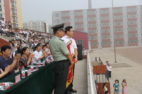 匯報表演結束后,柳韶軍副院長宣讀了學院表彰2013級新生軍訓先進集體、優秀個人名單,并頒發了先進集體和個人獎狀和榮譽證書;竇新順院長將印有“軍訓凝深情 共建結碩果”的錦旗贈予承訓部隊學院。