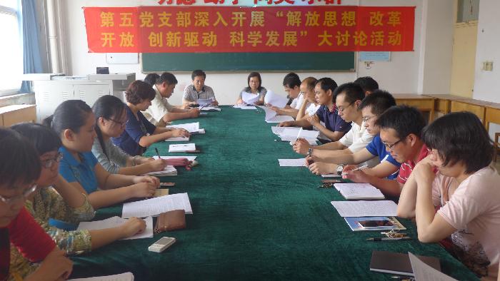 根據(jù)學院黨委深入開展大討論活動實施方案的安排部署, 2013年5月23日下午,第五黨支部在綜合教學樓502教室召開“解放思想、改革開放、創(chuàng)新驅(qū)動、科學發(fā)展”大討論學習活動,副院長柳韶軍同志出席學習活動并做重要講話,支部全體教職員工參會。會議由第五黨支部書記李桂榮同志主持。