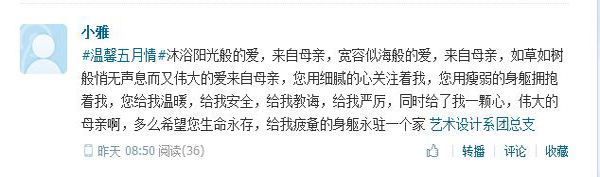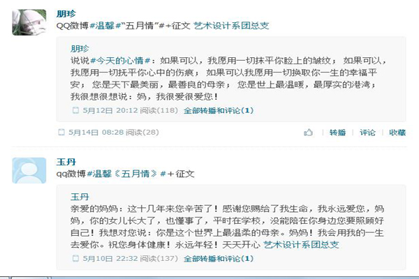 時至五月,身邊似乎總繞不開溫情的主旋律,為引導廣大青年學生學會關(guān)心母親、學會感恩,5月8日--5月14日藝術(shù)設(shè)計系開展了“溫馨五月情”微作文活動。