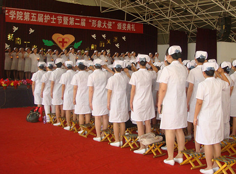 伴隨著一曲悠揚的中國護士之歌,此次活動拉開了帷幕。隨后秦秀紅副主任發表講話:她感謝這一年為護理系付出艱辛和汗水的各位老師,并向踏踏實實前進中的護理系獻上了美好的祝福。隨后的一個重要環節是鄭重的授帽儀式:只見護理系的同學們昂起青春的頭顱,承接潔白的燕尾帽;她們接過前輩點燃的蠟燭,輕輕地捧在手心,全體同學起立并莊嚴宣誓。