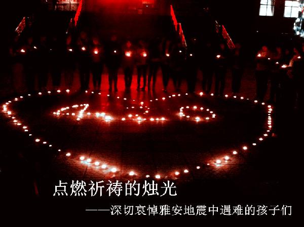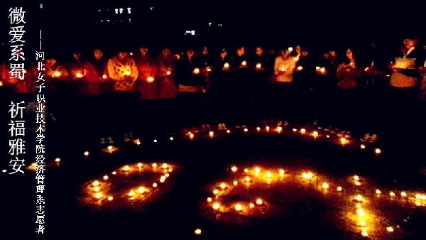 4月21日晚19:30分,河北女子職業技術學院經濟管理系100余名學生自發組織了為雅安祈福活動。同學們買來蠟燭,在小廣場將蠟燭點燃,并擺放成“心”形,中間用蠟燭擺出“4.20”三個數字。同學們手持蠟燭,默默為受災群眾祈福。天災無情,人間有情,我們心相連,同學們不停地齊聲喊出“雅安,我們和你在一起!”“雅安,加油!”參加祈福的同學紛紛表示,希望自己小小的祈禱和祝福讓雅安人民堅強起來,我們會用一顆強大愛心來支持雅安人民,我們永遠在一起,共同渡過難關!為雅安加油,為雅安受災同胞祈福!