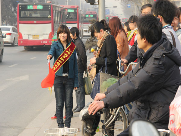 第一隊:藝術設計系團總支30余名青年志愿者來到新百廣場附近交通最繁忙、人流車流最擁堵的路口,協助交警疏導交通,幫助行人指路,她們的溫馨服務為廣大市民平安順利出行提供了保障。
