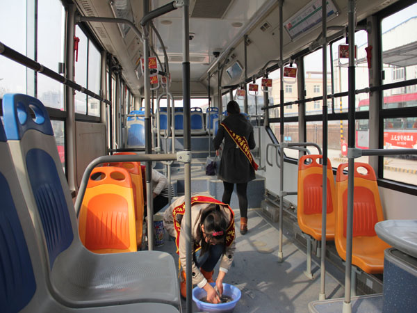 第二隊:藝術設計系團總支20余名青年志愿者來到石家莊公交四公司,協助93路車隊清洗公交車。同學們有的負責打掃,有的負責打水,有的負責擦車,很快公交車煥然一新。