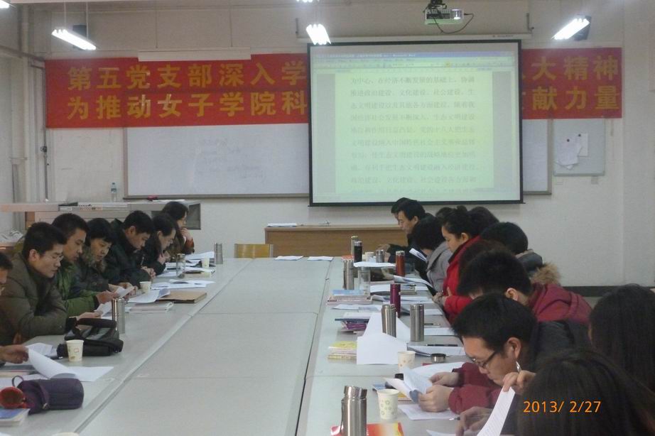 根據(jù)學(xué)院黨委關(guān)于開展學(xué)習(xí)黨的十八大精神活動的安排部署,2013年2月27日,第五黨支部在實(shí)訓(xùn)樓603教室組織全體支部成員進(jìn)行了第二個(gè)學(xué)習(xí)日的集中學(xué)習(xí)。