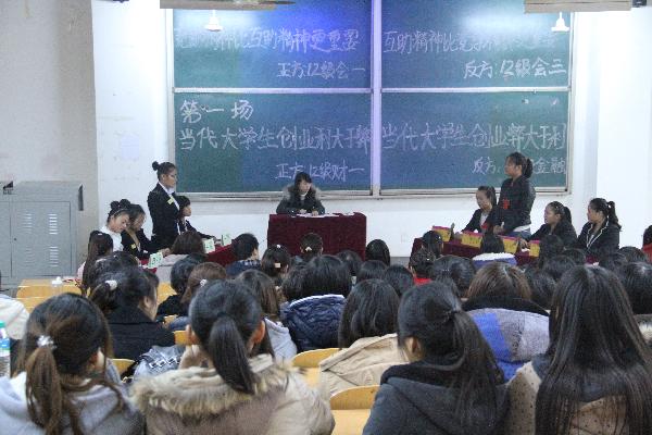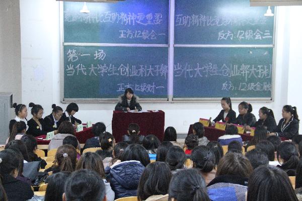 最后的決賽在2012級會計電算化3班和2012級金融保險班之間展開,雙方的辯題為“愛一行、干一行”還是“干一行、愛一行”,這場比賽可謂強強對決,精彩紛呈,雙方唇槍舌戰、互不相讓,經過評判團公平、公開、公正的評分,正方2012級會計電算化3班獲得比賽冠軍,2012級金融保險班和2012級會計電算化1班分獲亞軍和季軍,2012級會計電算化3班韓蕊蕊和2012級金融保險賈寶焰獲得“最佳辯手”稱號。