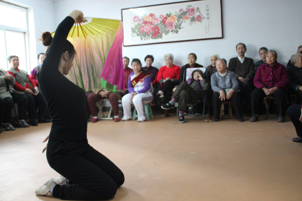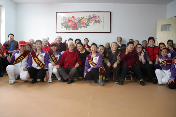 同學們的到來受到了付院長和老人們的熱烈歡迎?;顒又?,同學們先到老人們房間看望了各位老爺爺、老奶奶,陪他們聊天,幫他們收拾屋子。隨后,志愿者們為老人們獻上了精心準備的節目,表演獨舞《詠荷》的同學舞姿優美,輕盈曼妙;葫蘆絲演奏《月光下的鳳尾竹》音色輕柔細膩,圓潤質樸;豫劇《花木蘭》唱腔雅致俏麗,韻味十足……老人們聽得興致昂揚,為我們表演了他們活力十足的健身操《最炫民族風》、《套馬桿》,并和志愿者們一起合唱了《夕陽紅》,整個老年公寓充滿了歡聲笑語。兩個小時的時間很快就過去了,志愿者們和老人合影留念,老人們依依不舍的把大家送到了樓梯口,與志愿者們揮手告別。