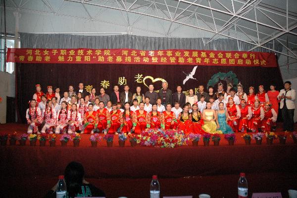啟動儀式后,河北省老年藝術團和我院學生獻上了精彩的文藝匯演,我院學生表演的舞蹈“花兒為什么這樣紅” 和“剪紙姑娘”得到現場觀眾的熱烈掌聲。河北省老年藝術團夕陽紅舞蹈隊獻上的舞蹈“童心回放”和“鄂爾多斯”跳出了老年人那飽滿的熱情,將演出推向高潮,最后在歌伴舞“歡天喜地”中結束了本次匯演。參加啟動儀式的領導與全體演職人員進行了合影留念。演出結束后,經濟管理系助老青年志愿團為在場老年人獻上了我院師生親手做的重陽糕。