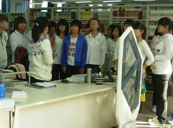 參觀圖書館,同學們在認真聽圖書館老師介紹