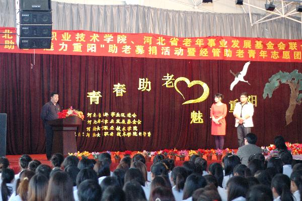 啟動儀式上,學院副院長柳韶軍致開幕辭,簡要介紹了學院的發(fā)展歷史、辦學成就及在敬老助老活動上的新舉措。他指出,我院自2009年起,學院積極響應團省委發(fā)出的“孝敬父母、尊敬老人,為親人和老人送去關(guān)愛”的號召,在橋西區(qū)瑞祥老年公寓、西三教福利院建立了校外社會實踐基地,為青年學生搭建了一個關(guān)愛老人、服務社會的平臺,逐漸形成了一支專業(yè)化、常態(tài)化的助老志愿者隊伍。省老年事業(yè)促進會常務副會長、省老年事業(yè)發(fā)展基金會常務副理事長、秘書長孫鳴改發(fā)表了熱情洋溢的講話,并向我院五名特困家庭學生代表杜海燕、張沙、馬會娟、周博、劉紅濤各捐助了300元現(xiàn)金。姜文匯副會長向?qū)W院頒發(fā)了“敬老助老愛心單位”牌匾。中共河北省委老干部局原局長、省老年事業(yè)發(fā)展基金會理事長王惠來與學院交接助老工程募捐箱,并向經(jīng)濟管理系助老志愿團授旗。