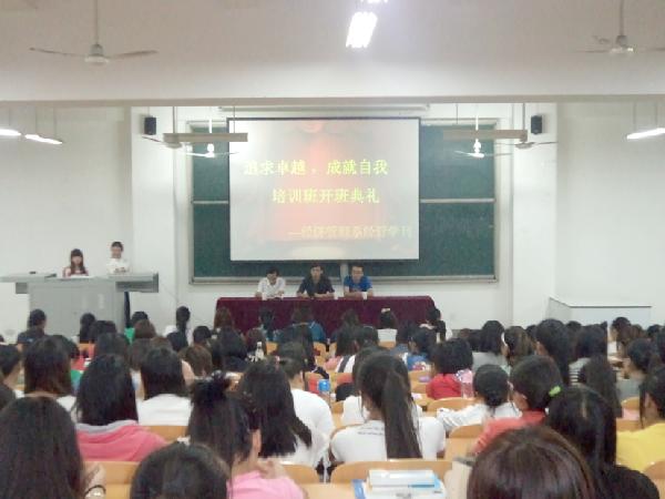 2012年9月18日晚,由經濟管理系《經管學刊》主辦的“追求卓越,成就自我”為主題的培訓班開班典禮在圖書館206教室如期舉行。團總支書記陳麗敏老師、教學秘書康江衛老師、報刊指導老師于立強老師、就業指導員李佳老師、學生會主席馮柳陽同學、《經管學刊》主編杜香同學、副主編郭亞靜同學以及《經管學刊》全體成員出席了本次活動,2012級全體新生參加了此次開班典禮。