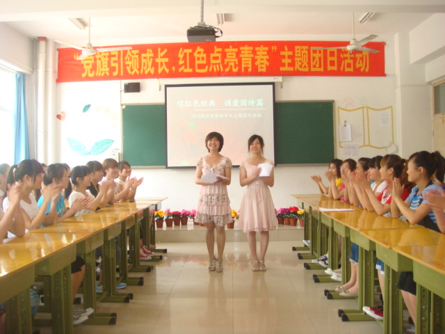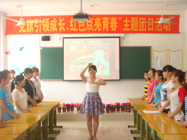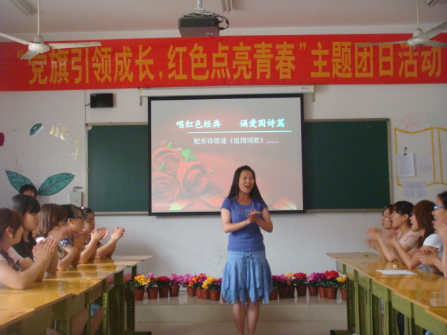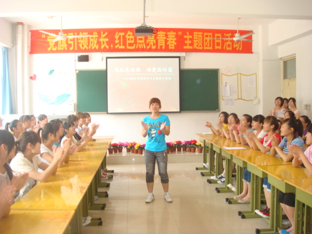 本次團日活動立意新穎、形式活潑、教育效果突出。包括紅色歌曲獨唱、合唱、配樂詩朗誦等學生喜聞樂見的活動形式。一曲《沒有共產黨就沒有新中國》的歌聲中拉開帷幕。配樂詩朗誦《頌歌獻給黨》、《祖國頌歌》等深深地表達了大家對黨和國家的贊美之情。歌曲《愛我中華》表達了五十六個民族緊緊團結在黨的周圍,萬眾一心,共創祖國美好的明天的堅定決心。劉婷同學帶領大家唱響《走進新時代》,把整個活動推向高潮。