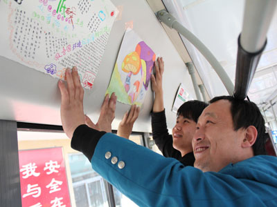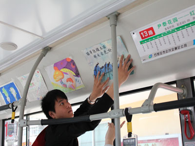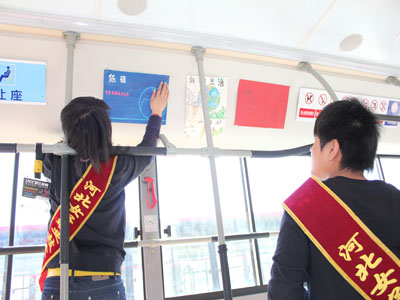 藝術設計系的青年志愿者們,利用課余時間親手繪制了五十余張以“綠色環保,低碳出行”為主題的手工海報,并與公交公司的職工一起將其中的三十五張海報裝飾在13路公交車上,以倡導廣大市民從自身做起、從現在做起、從乘坐公交車開始,堅持綠色出行,共同營造我們美好的綠色家園。張貼了我院藝術設計系志愿者們親手繪制海報的13路公交車,連續運營了兩天。本次活動已被石家莊電視臺“民生關注”欄目予以報導。
