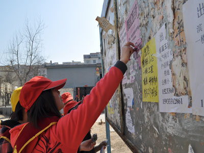 為了弘揚雷鋒精神,3月8日我系團總支組織志愿者們開展了“去除城市牛皮癬”的志愿者活動。