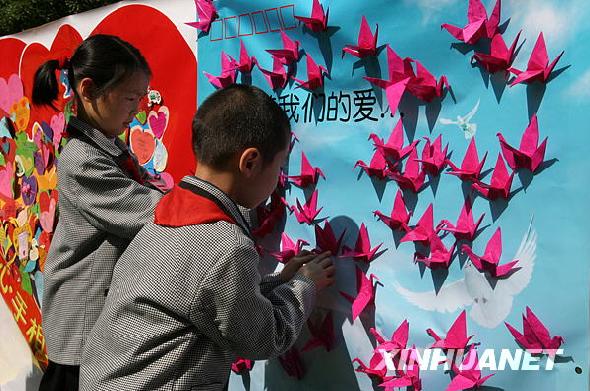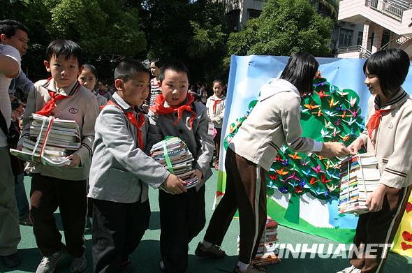 當日,福州教育學院第二附屬小學啟動“心手相牽、共筑明天”紀念“5·12”汶川地震一周年系列活動,通過傾聽親歷災區同學講重建故事、向災區小朋友寄愛心卡、捐獻新書等方式號召全校師生關注災區重建,弘揚奉獻、友愛、互助、進步精神。新華社記者姜克紅 攝