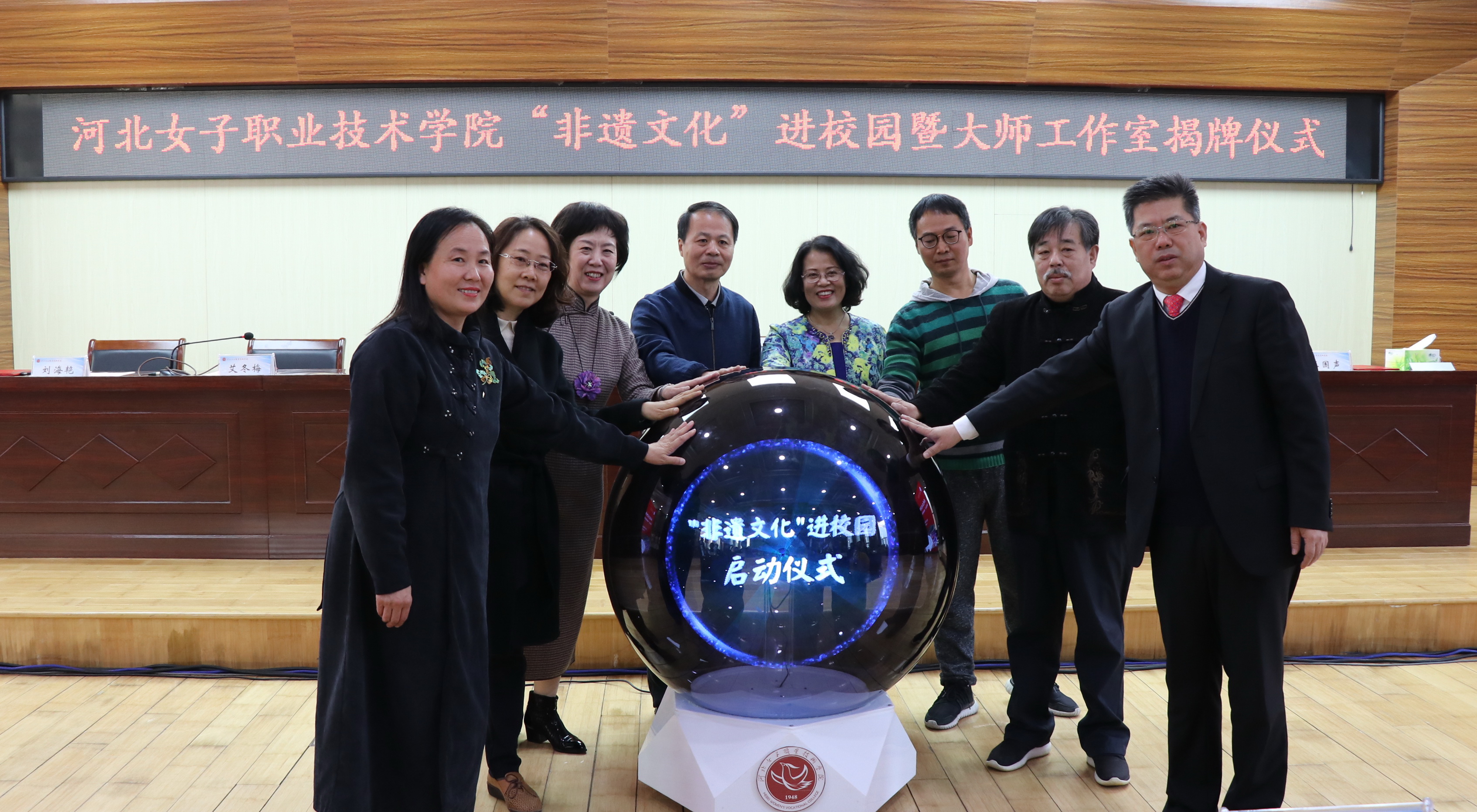 與會領導詹文宏、耿樹偉、郭麗萍、麻士琦、艾冬梅、趙永華,非遺傳承人王國聲、劉海艷共同點亮“非遺文化進校園“啟動球”,啟動河北女子職業技術學院“非遺文化進校園”活動。