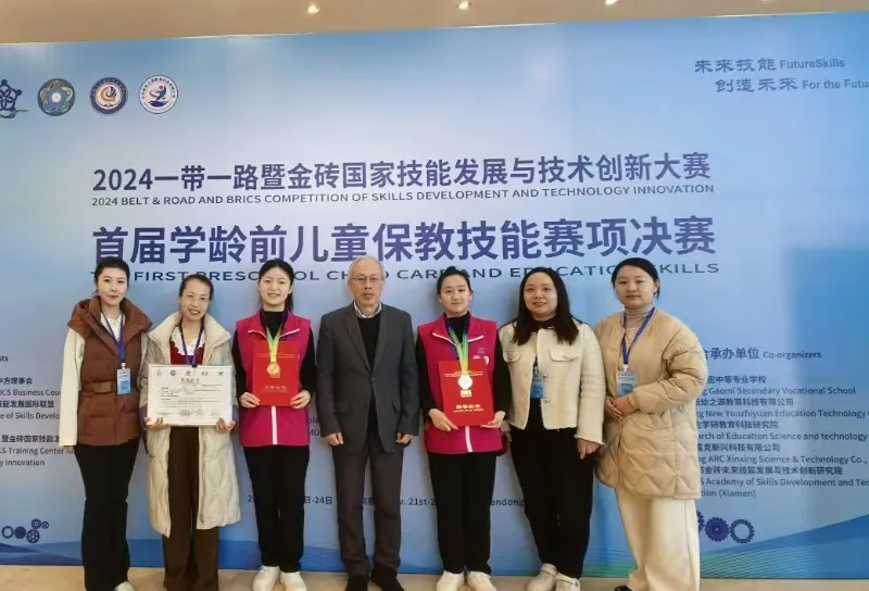 河北女子職業技術學院學前教育系副主任陳娜帶領指導教師王超、趙馨、關聰及學生崔天銥、姜睿參賽,榮獲金獎,高校組團體第一名,王超、趙馨獲優秀指導教師,學院獲得最佳組織獎。姜睿和崔天銥同學在比賽中,以飽滿精神的精神狀態,嫻熟的技能操作、扎實的保教能力、精彩的現場展示,展現了扎實的專業技能和良好的職業素養。