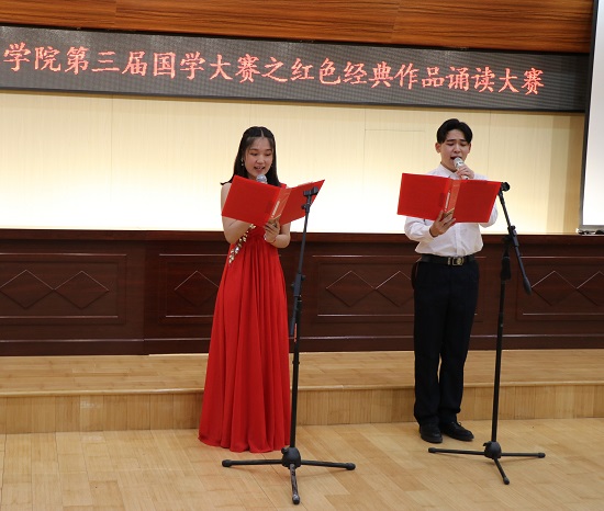 本次誦讀比賽作品涉及紅色經典作品、名篇美文等,比賽設學生組和教師組兩個組別,參賽作品25個。以個人誦讀、集體誦讀等形式傳承弘揚中華優秀傳統文化。比賽中,師生代表激情飛揚的吟唱、清淡儒雅的低誦、聲情并茂的表演,使現場觀眾沉浸在熱烈激昂的愛國主義情境中。