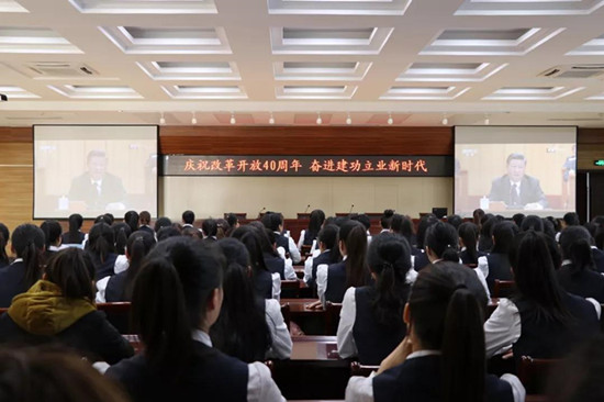 2018年12月18日10時,慶祝改革開放40周年大會在北京人民大會堂隆重舉行。中共中央總書記、國家主席、中央軍委主席習(xí)近平出席大會并發(fā)表重要講話。河北女子職業(yè)技術(shù)學(xué)院黨委組織學(xué)院教職工和學(xué)生在會議室、報告廳、教室等地收聽、收看大會盛況,領(lǐng)會大會精神,深切感受改革開放40周年的輝煌成就。