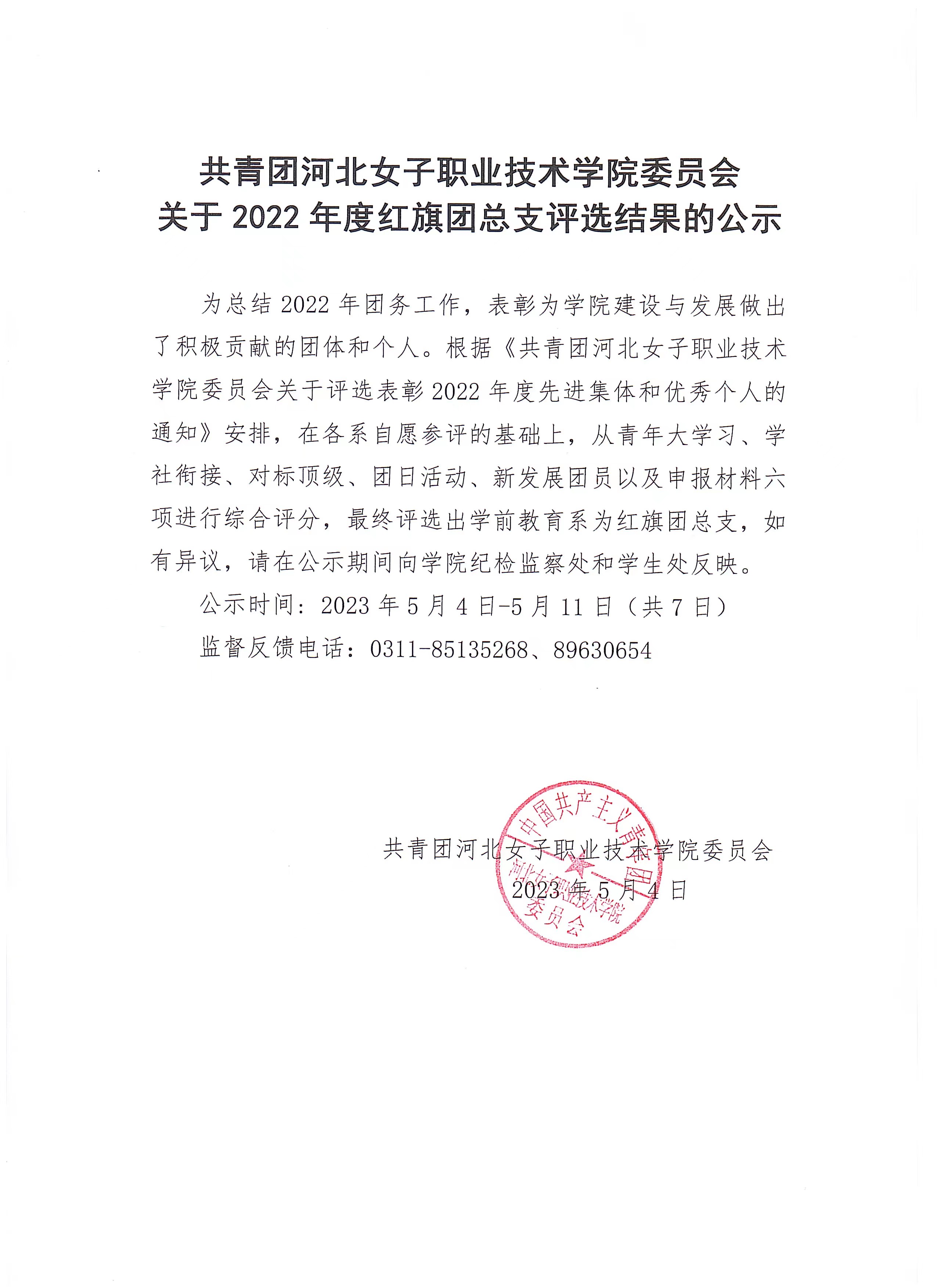 共青團河北女子職業技術學院委員會關于2022年度紅旗團總支評選結果的公示