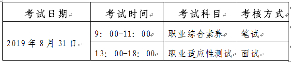 考試主要測試考生的職業技能,考試科目設置為職業綜合素養和職業適應性測試兩個科目,滿分750分。職業綜合素養采用筆試的方式,考試時間為120分鐘,分值400分;職業適應性測試采用面試的方式,分值350分。