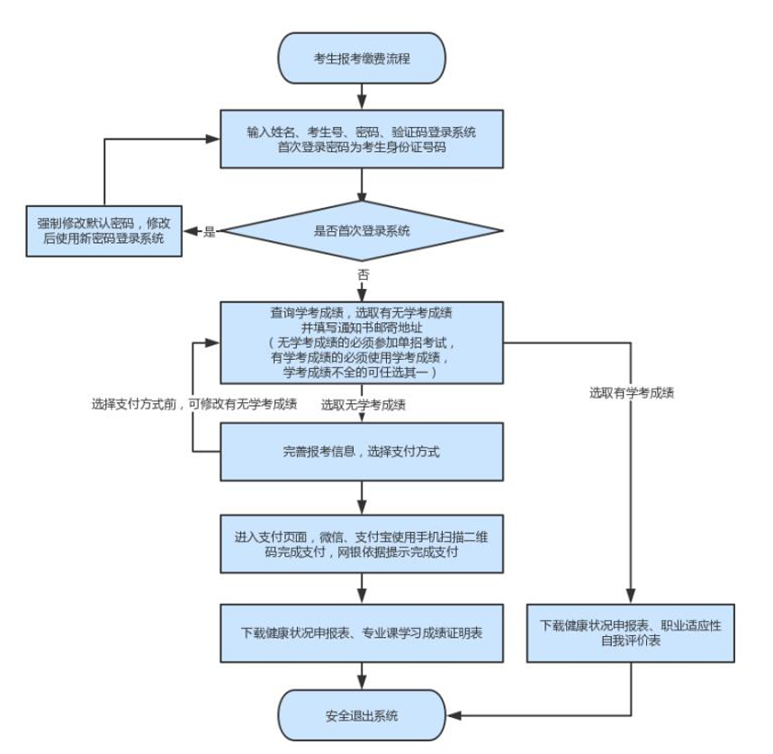 (4)考生沒有語文、數學學考成績的,錄取類別須選擇“無學考成績”,需參加單招考試。選擇后進入繳費頁面,確定支付方式(支付方式確定后將無法修改有無學考成績等報考信息)。考生選擇微信或支付寶支付的,掃描二維碼完成支付;選擇網銀支付的,根據網頁提示完成支付。支付完成后,下載健康狀況申報表(附件4)、專業課學習證明表,下載完畢后點擊“退出”按鈕安全退出系統。
