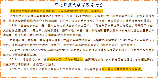 河北師范大學家政學是目前國內唯一開設家政學相關專業的一本高校。